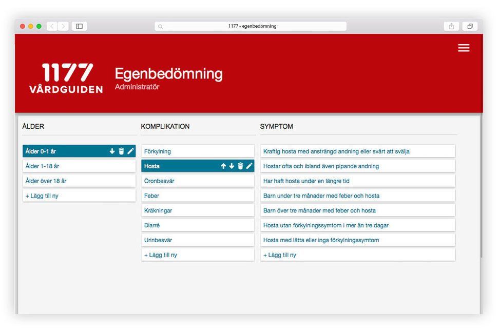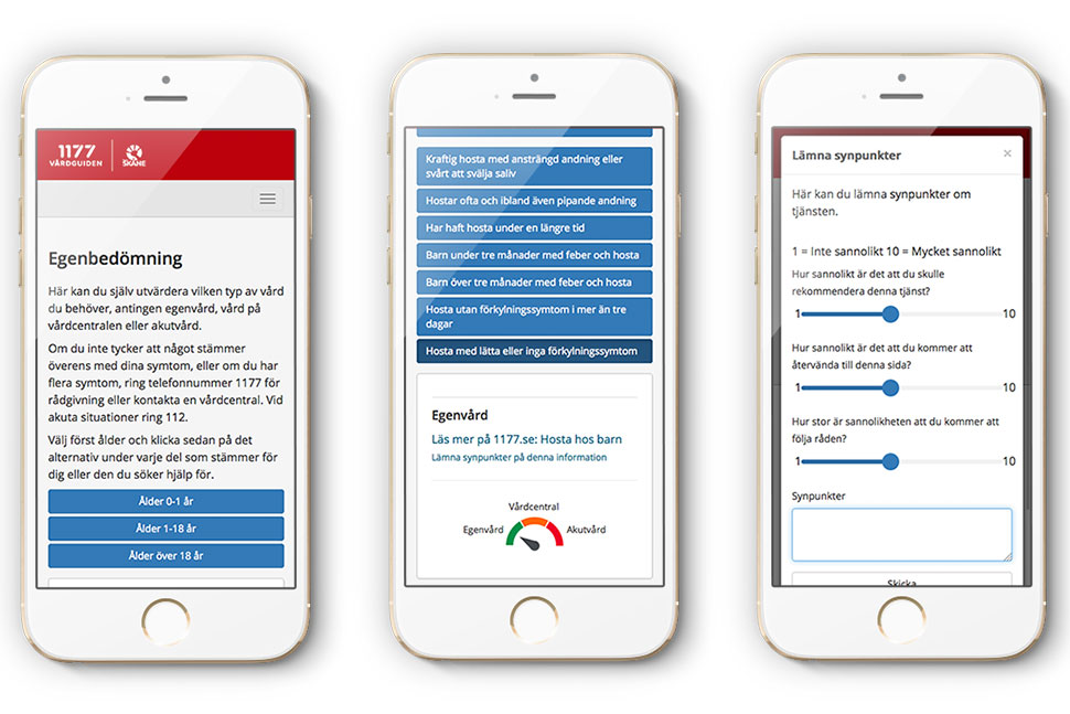 – sökte 1177 en webbaserad tjänst där vi medborgare kunde få hjälp med en bedömning av vilken typ av vård vi behöver. Genom några få klick i en hierarkisk frågestruktur blir utslaget blir antingen egenvård, vård på vårdcentralen eller akutvård.