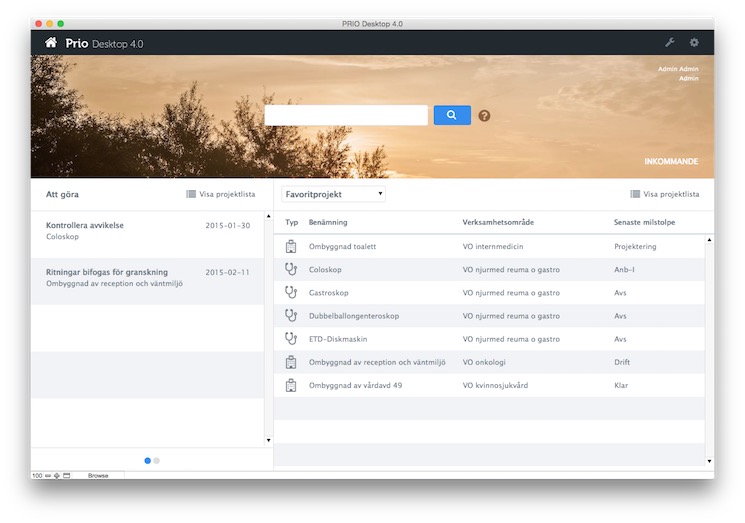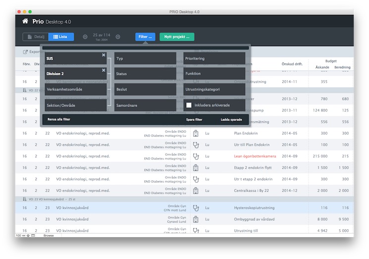 Processen börjar med att kliniken beskriver sitt investeringsbehov och slutar med ett genomfört projekt. För att kunna hantera detta har systemet PRIO utevcklats tillsammans med Enheten för fysisk utvecklings på Skånes universitetssjukhus.