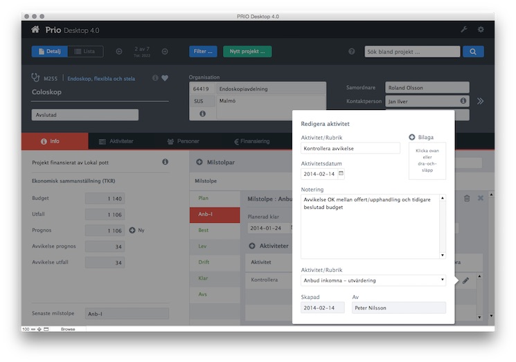 - Detaljerad projekthantering med milstolpar, aktiviteter (bevakning/flaggning) och dokumenthantering